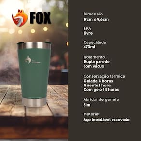 Marca: Fox Stainless | BPA Free (Livre de resíduos plásticos): Sim | Cor: Verde | Capacidade(ml): 473 | Parede dupla com isolamento a vácuo: Sim | Bebida Gelada (horas): 4 | Bebida Quente (horas): 1 | Com Gelo (horas): 17 | Abridor de garrafa acoplado: Sim | Aço inoxidável escovado: Sim | Tipo de Recipiente: Copo
