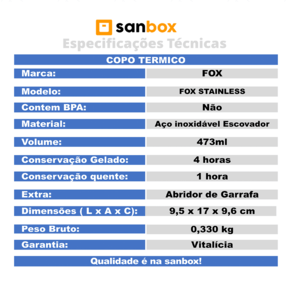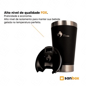 Com cada mínimo detalhe, a Fox pensou muito em você consumidor, aplicando deste a textura palpável do copo até a borracha que segura a tampa, garantindo mais qualidade possível ao produto.