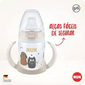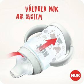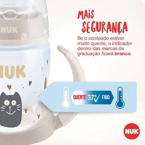 Principais características: - idade recomendada: a partir de 6 meses - capacidade: 150ml - cores atóxicas - livre de bisfenol-a - design moderno ergonômico - fechamento rosqueado - material leve resistente - sistema anti vazamento - bocal largo que facilita a higienização - alças antiderrapantes para melhor aderência na pega - possui indicador de controle de temperatura - bico em silicone macio - possui válvula air system - reduz a formação e ingestão de bolhas de ar - não levar à lava-louças a lava louças pode causar danos ao produto - esterilizar em água fria ou com o esterilizador de micro-ondas nuk