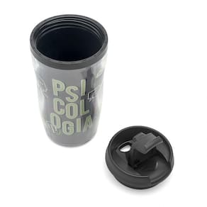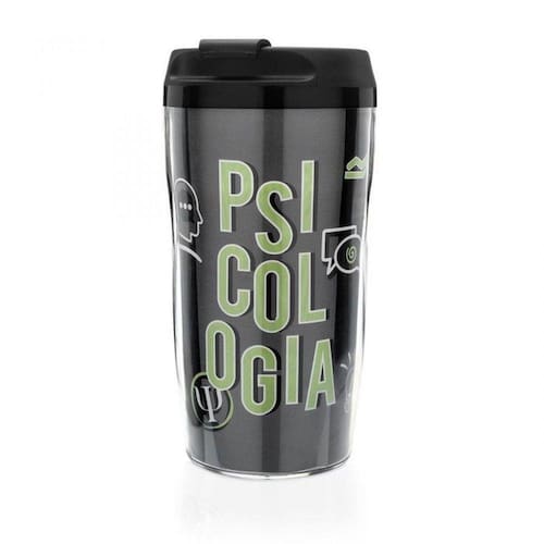 ""Boa conduta e sempre na escuta"". A mensagem já entrega, a profissão é psicologia. E o presente é um copo para viagem, aquele copo para levar pra lá e pra cá, no trabalho, na aula ou na viagem. Que tal presentear aquele amigo ou aquela amiga com uma homenagem ao diploma? Com um gráfico que reforça a combinação entre tons de preto, cinza e verde + ícones característicos da profissão, este copo tem 250ml. Perfeito para um café, chá ou chocolate quente para recarregar as energias. Atenção: não é um copo térmico. Este produto não tem vedação térmica, apenas possui uma tampa e parede dupla. Não coloque o produto na geladeira ou no congelador. Choques ou quedas podem danificá-lo. Para evitar vazamentos, carregue o produto apenas na posição vertical, não coloque em mochilas ou bolsas. Este copo é BPA Free!