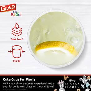 - Copos transparentes com designs do Mickey Mouse – Faça de qualquer reunião ou evento uma festa ao usar copos de plástico Glad for Kid neste lindo design do Mickey Mouse.
