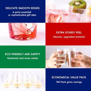 Cada pacote inclui 100 copos de plástico transparente para uso doméstico, evento ou comercial.