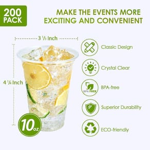 - Não precisa de limpeza: cada pacote inclui 200 contagens de copos de plástico transparente de 293 ml, quantidade suficiente para atender a todos os seus requisitos. Descartável e durável, então não há necessidade de limpeza após os eventos. Você pode simplesmente jogá-los no lixo