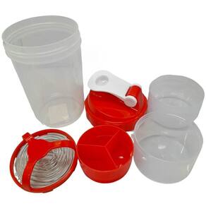 A Coqueteleira Quanhe possui design funcional com três compartimentos separados para facilitar o transporte de suplementos em cápsulas e em pó. Com capacidade de 500ml, é indicada para uso em academias e durante atividades físicas.