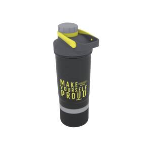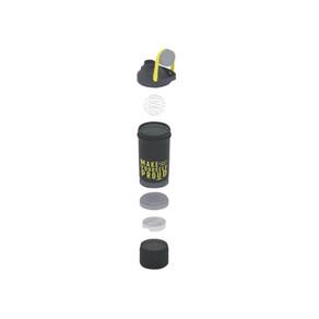Possui misturador para facilitar o preparo de suas vitaminas, indicação de volume e compartimentos para o transporte de cápsulas.