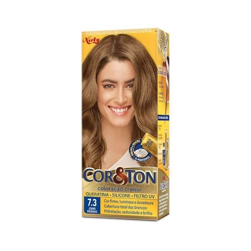 Cor & Ton Tinta 7.3 Louro Dourado 50g DESCRIÇÃO: É uma coloração permanente com fórmula de altíssima qualidade. Proporciona aos cabelos cores vivas, luminosas e duradouras. Total cobertura dos fios brancos. Hidratação, sedosidade e brilho.AÇÃO/ATIVOS: Com queratina, gérmen de trigo, silicone e filtro UV que garantem cabelos fortes, nutridos e com máxima proteção. Com textura cremosa, facilita a distribuição nos fios, fazendo com que os pigmentos sejam facilmente absorvidos.MODO DE USAR: Utilizar conforme indicado na embalagem.ESTE ANÚNCIO CONTÉM: 01 Cor & Ton Tinta 7.3 Louro Dourado 50gCor & Ton Tinta 7.3 Louro Dourado 50g