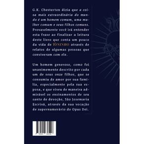 G.K. Chesterton dizia que a coisa mais extraordinária do mundo é um homem comum, uma mulher comum e seus filhos comuns. Provavelmente você irá entender esta frase ao finalizar a leitura deste livro que conta um pouco da vida de Toninho através de relatos de algumas pessoas que conviveram com ele. Um homem generoso, como foi unanimemente descrito por cada um de seus onze filhos, que se consumiu de amor por sua família, especialmente pela sua esposa, e que viveu de maneira admirável os ensinamentos de seu santo de devoção, São Josemaria Escrivá, através da sua vocação de supernumerário do Opus Dei.