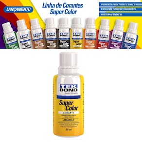 Corante Liquido para Tintas Super Color Amarelo 50 ml Tek Bond Corante Liquido para Tintas Super Color Amarelo 50 ml Tek Bond A Linha de Corante Líquido Tekbond à Base dÀgua, é uma linha completa Disponível em 10 cores misturáveis entre si, possibilitando infinitas combinações de cores. Com excelente poder de tingimento, pode ser utilizado em diversas aplicações. - Marca: Tek Bond - Conteúdo: 50ml - Cor: Amarelo - Excelente poder de tingimento - Cores misturáveis entre si - Fácil de homogeneizar - Versátil - Quantidade: 1 unidade - Peso: 0,070Kg - Dimensões do produto: 3,0cm x 9,0cm L x A - : 90 dias MODO DE USO: Agite bem o Corante Líquido Tekbond antes e durante a aplicação. Adicione-o aos poucos à tinta, sempre sobre agitação, até chegar ao tom desejado. Utilize no máximo um frasco 50ml de corante por galão de tinta 3,6 L, mantendo essa proporcionalidade para as demais embalagens. Marca: Não Informado
