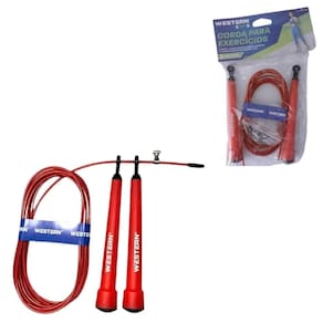 Dimensões da peça: Corda: 300 x 0,2 x 0,2cm Manoplas: 14,5 x 2 x 2cm Material: aço, plástico, pvc Cor: vermelho Marca: western fitness Espessura da corda: 2,5mm
