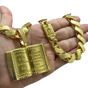Cordão 13mm Friso S + Pingente Bíblia - Banhado a ouro Detalhes do Produto: Material: ligas metálicas de alta qualidade, especialmente tratadas para fixação e absorção do ouro, com acabamento em verniz protetor. Aparência: visual idêntico ao ouro maciço. Produção: artesanal, com atenção meticulosa aos detalhes. Banho: 10 camadas espessas de ouro 18k, finalizadas com verniz antialérgico . Elos: soldados varia conforme o modelo . Pedras: zircônias brilhantes cravejadas quando aplicável . Tamanhos Disponíveis: Cordões Masculinos: 70cm padrão e 60cm sob consulta/Pedido Via Chat . Cordões Femininos: 50cm padrão e 45cm sob consulta/Pedido Via Chat . Pulseiras: 21cm padrão ; tamanhos de 18cm a 23cm sob consulta/Pedido Via Chat. Pingentes: conforme imagens; consulte para mais detalhes via chat. Espessuras Recomendadas para Cordões / Pingentes: P: 1mm a 4mm M: 4mm a 8mm G: 6mm a 13mm Gg: 12mm a 18mm Incluso na Compra: Saquinho de organza para armazenamento seguro. Caixa elegante, perfeita para presente. Cupom de desconto para a próxima compra. Flyer com outros produtos da coleção. Carta de agradecimento personalizada. Adesivo da marca ToJoia18k. Informações Adicionais: : 6 meses termos acompanham o produto . Devolução: 7 dias para devolução sem questionamentos. Envio: despacho em até 24 horas úteis após confirmação do pagamento. Cuidados com a Peça: Evite contato com produtos químicos; aguarde o perfume secar antes de usar. Evite contato com shampoo, condicionadores e suor excessivo. Armazene em local seco, preferencialmente no saquinho de organza fornecido. Uso no mar e piscina é permitido; lave com água corrente e sabão neutro após. Por que Escolher a ToJoia18k Semi-joias luxuosas que combinam estilo, qualidade e sofisticação. Banho espesso de ouro 18k, garantindo brilho duradouro e acabamento impecável. Design exclusivo e produção artesanal, perfeitos para qualquer ocasião. Materiais premium que asseguram durabilidade. Ao escolher uma semi-joia ToJoia18k, você investe em qualidade, elegância e uma experiência única. Aguardamos sua compra Observação: pode ocorrer variação no fecho raramente . Imagens reais, sem edição. Qualquer dúvida, estamos à disposição para esclarecimentos. Marca: Não Informado Ean: 7899457505618