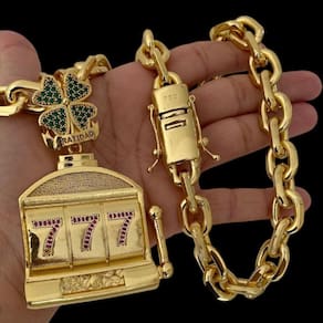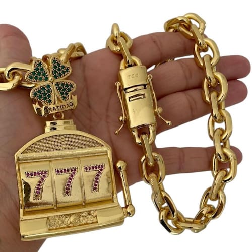 Cordão 18mm Cadeado + Pingente 777 - Banhado a ouro Detalhes do Produto: Material: ligas metálicas de alta qualidade, especialmente tratadas para fixação e absorção do ouro, com acabamento em verniz protetor. Aparência: visual idêntico ao ouro maciço. Produção: artesanal, com atenção meticulosa aos detalhes. Banho: 10 camadas espessas de ouro 18k, finalizadas com verniz antialérgico . Elos: soldados varia conforme o modelo . Pedras: zircônias brilhantes cravejadas quando aplicável . Tamanhos Disponíveis: Cordões Masculinos: 70cm padrão e 60cm sob consulta/Pedido Via Chat . Cordões Femininos: 50cm padrão e 45cm sob consulta/Pedido Via Chat . Pulseiras: 21cm padrão ; tamanhos de 18cm a 23cm sob consulta/Pedido Via Chat. Pingentes: conforme imagens; consulte para mais detalhes via chat. Espessuras Recomendadas para Cordões / Pingentes: P: 1mm a 4mm M: 4mm a 8mm G: 6mm a 13mm Gg: 12mm a 18mm Incluso na Compra: Saquinho de organza para armazenamento seguro. Caixa elegante, perfeita para presente. Cupom de desconto para a próxima compra. Flyer com outros produtos da coleção. Carta de agradecimento personalizada. Adesivo da marca ToJoia18k. Informações Adicionais: : 6 meses termos acompanham o produto . Devolução: 7 dias para devolução sem questionamentos. Envio: despacho em até 24 horas úteis após confirmação do pagamento. Cuidados com a Peça: Evite contato com produtos químicos; aguarde o perfume secar antes de usar. Evite contato com shampoo, condicionadores e suor excessivo. Armazene em local seco, preferencialmente no saquinho de organza fornecido. Uso no mar e piscina é permitido; lave com água corrente e sabão neutro após. Por que Escolher a ToJoia18k Semi-joias luxuosas que combinam estilo, qualidade e sofisticação. Banho espesso de ouro 18k, garantindo brilho duradouro e acabamento impecável. Design exclusivo e produção artesanal, perfeitos para qualquer ocasião. Materiais premium que asseguram durabilidade. Ao escolher uma semi-joia ToJoia18k, você investe em qualidade, elegância e uma experiência única. Aguardamos sua compra Observação: pode ocorrer variação no fecho raramente . Imagens reais, sem edição. Qualquer dúvida, estamos à disposição para esclarecimentos. Marca: Tojoia18K