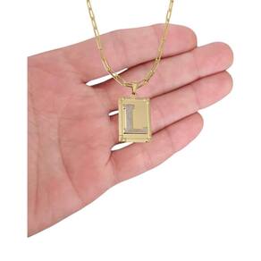 Corrente Colar Cordão modelo unissex pingente letra inicial L banhado em Ouro 18k. Colar com Pingente Retangular banhado em Ouro 18k, com acabamento impecável em Ródio branco que destaca ainda mais a beleza da peça. O centro do pingente traz uma letra inicial personalizada, tornando-o uma joia exclusiva e carregada de significado. Delicado e sofisticado, este colar é perfeito para quem busca elegância e personalização em um só acessório, ideal para presentear ou usar em ocasiões especiais. Especificações do produto: Colar banhado a Ouro 18k. Antialérgico. Modelo do fecho do colar: lagosta. Espessura do colar: 2 mm. Peso do colar com o pingente: 6 g. Pingente letra inicial retangular com detalhes em Ródio branco banhado a Ouro 18k. Tamanho do pingente: 3 cm altura x 2 cm largura. Acompanha linda caixinha de presentes. Seguindo nossas orientações de uso no certificado de a joia permanecerá conservada por longos anos ou até décadas Marca: Não Informado