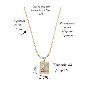 Corrente Colar Cordão modelo unissex pingente letra inicial Z banhado em Ouro 18k. Colar com Pingente Retangular banhado em Ouro 18k, com acabamento impecável em Ródio branco que destaca ainda mais a beleza da peça. O centro do pingente traz uma letra inicial personalizada, tornando-o uma joia exclusiva e carregada de significado. Delicado e sofisticado, este colar é perfeito para quem busca elegância e personalização em um só acessório, ideal para presentear ou usar em ocasiões especiais. Especificações do produto: Colar banhado a Ouro 18k. Antialérgico. Modelo do fecho do colar: lagosta. Espessura do colar: 2 mm. Peso do colar com o pingente: 6 g. Pingente letra inicial retangular com detalhes em Ródio branco banhado a Ouro 18k. Tamanho do pingente: 3 cm altura x 2 cm largura. Acompanha linda caixinha de presentes. Seguindo nossas orientações de uso no certificado de a joia permanecerá conservada por longos anos ou até décadas
