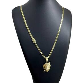 Cordão 5mm Piastrine + Pingente Fé Escudo - Banhado a ouro Detalhes do Produto: Material: ligas metálicas de alta qualidade, especialmente tratadas para fixação e absorção do ouro, com acabamento em verniz protetor. Aparência: visual idêntico ao ouro maciço. Produção: artesanal, com atenção meticulosa aos detalhes. Banho: 10 camadas espessas de ouro 18k, finalizadas com verniz antialérgico . Elos: soldados varia conforme o modelo . Pedras: zircônias brilhantes cravejadas quando aplicável . Tamanhos Disponíveis: Cordões Masculinos: 70cm padrão e 60cm sob consulta/Pedido Via Chat . Cordões Femininos: 50cm padrão e 45cm sob consulta/Pedido Via Chat . Pulseiras: 21cm padrão ; tamanhos de 18cm a 23cm sob consulta/Pedido Via Chat. Pingentes: conforme imagens; consulte para mais detalhes via chat. Espessuras Recomendadas para Cordões / Pingentes: P: 1mm a 4mm M: 4mm a 8mm G: 6mm a 13mm Gg: 12mm a 18mm Incluso na Compra: Saquinho de organza para armazenamento seguro. Caixa elegante, perfeita para presente. Cupom de desconto para a próxima compra. Flyer com outros produtos da coleção. Carta de agradecimento personalizada. Adesivo da marca ToJoia18k. Informações Adicionais: : 6 meses termos acompanham o produto . Devolução: 7 dias para devolução sem questionamentos. Envio: despacho em até 24 horas úteis após confirmação do pagamento. Cuidados com a Peça: Evite contato com produtos químicos; aguarde o perfume secar antes de usar. Evite contato com shampoo, condicionadores e suor excessivo. Armazene em local seco, preferencialmente no saquinho de organza fornecido. Uso no mar e piscina é permitido; lave com água corrente e sabão neutro após. Por que Escolher a ToJoia18k Semi-joias luxuosas que combinam estilo, qualidade e sofisticação. Banho espesso de ouro 18k, garantindo brilho duradouro e acabamento impecável. Design exclusivo e produção artesanal, perfeitos para qualquer ocasião. Materiais premium que asseguram durabilidade. Ao escolher uma semi-joia ToJoia18k, você investe em qualidade, elegância e uma experiência única. Aguardamos sua compra Observação: pode ocorrer variação no fecho raramente . Imagens reais, sem edição. Qualquer dúvida, estamos à disposição para esclarecimentos. Marca: Tojoia18K
