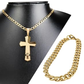Tenha o melhor em elegância e espiritualidade com este sofisticado kit, composto por uma corrente cordão dourada banhada aço inox com um belo pingente cruz Pai Nosso e uma pulseira dourada que confere um toque especial ao seu estilo.