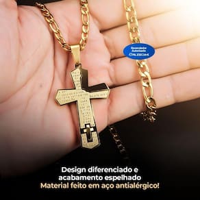 Cordão aço banhado ouro + pulseira + pingente pai nosso crucifixo religioso oração qualidade premium Kit Corrente Cordão Dourado Banhado Aço Inox com Pingente Cruz Pai Nosso, acompanhado de uma elegante Pulseira Dourada
