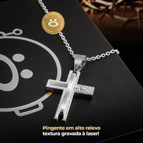 Cordão aço inox prata + pai nosso pingente cruz + caixa casual religioso estiloso moda masculina Cordão Masculino Prata 60 cm com Pingente Cruz 4 cm - Elegância e Estilo