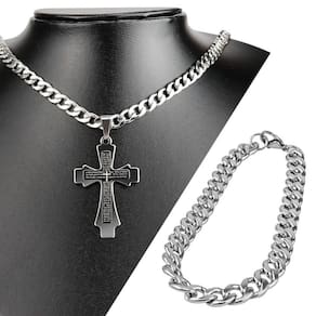 O Kit Corrente Cordão Prata Aço Inox com Pingente Cruz Pai Nosso + Pulseira em Aço Inox é mais do que uma joia; é uma manifestação de fé e estilo. Adquira agora este conjunto que une elegância e espiritualidade de maneira única. E lembre-se: o aço inox é altamente resistente e durável, garantindo um custo benefício sem igual. Compre já
