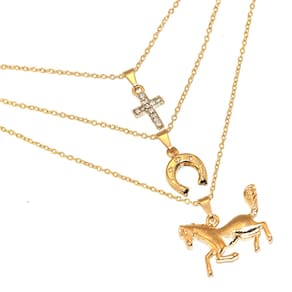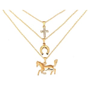 Cordão Colar Triplo Country Cavalo Ferradura Folheado 18k
