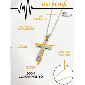 Cordão corrente 50cm pingente cruz crucifixo reza pai nosso prata dourado aço inox Cor: silver Cordão corrente 50cm pingente cruz crucifixo reza pai nosso prata dourado aço inox Corrente unissex em aço inox antialérgico com 50cm comprimento, elo cartier com 2mm de espessura com pingente cruz modelo perfeito para homens e mulheres que querem ficar na moda e dar um up no visual. Corrente aço inox premium. ====================================== Fotos reais do produto na galeria Detalhes técnicos: Marca: visujóias Modelo: corrente pingente Cor: prata e dourado respectivamente. Espessura corrente: 2mm Comprimento: 50cm Incluso: 1 unidade Material: aço inox Código do produto sku : 3437 : 6 meses. Todas as peças possuem tratamento antialérgico =================================================== P:minha compra é segura R:toda compra que é feita aqui está em ambiente seguro, isso significa que se caso ocorra algum imprevisto faremos o estorno. R: sim. P: produto é a prova d'água R: sim, pode usar em piscinas e praias que não escurece. P: tem R: sim, todos os nossos produtos tem de 6 meses, contra defeitos de fabricação. Todas as informações de cuidados são enviados junto com o produto. P: posta em quanto tempo P: posso trocar se não servir R: sim, enviamos nosso contato junto com o produto para orientação sobre troca. P: posso devolver se não gostar R: sim, caso não goste do produto é só entrar em contato conosco que iremos orientá-lo como efetuar a devolução. Dúvidas Pergunte à vontade, estamos aqui. ficaremos felizes em responder rapidamente. Aguardamos sua compra e estamos ao seu dispor : Marca: Não Informado Ean: 7732647218359