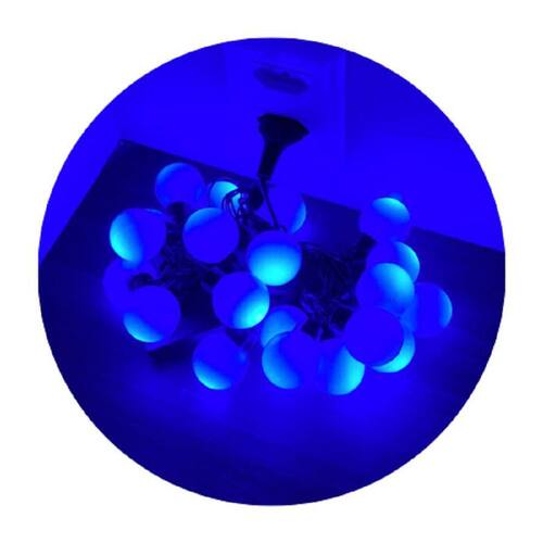 As lâmpadas possuem uma cor azul encantadora, combinando com qualquer decoração. O espaçamento entre as lâmpadas é de 22cm, garantindo uma distribuição uniforme da luz. Além disso, o fio preto dá um toque elegante e discreto ao conjunto.