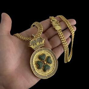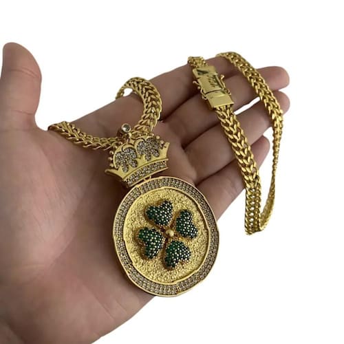 Cordão Lacraia 10mm + Pingente Trevo - Banhado a Ouro 18k