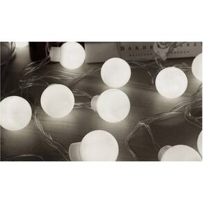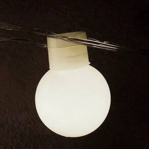O cordão é composto de um fio com 20 bolinhas de 5 cm com lâmpadas Led, sua fonte é na tomada bivolts