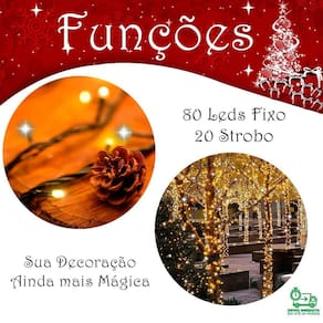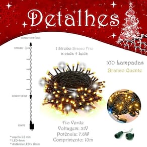 Cordão Pisca 100 Leds Fixo Com Strobo Prova D'Água 10M-Quente Destaque a decoração de Natal com este cordão de LED de alta qualidade e efeitos luminosos encantadores. Com 10 metros de comprimento e 100 LEDs cuidadosamente distribuídos, ele combina luzes fixas e strobo para criar um visual único e vibrante. Dos 100 LEDs, 80 emitem um tom branco quente e suave, perfeito para trazer aconchego e charme a qualquer ambiente. Esses LEDs de luz fixa são intercalados com 20 LEDs de branco frio no modo strobo, que piscam de forma ritmada a cada 4 LEDs fixos, criando um efeito cintilante e sofisticado. O fio verde discreto integra-se perfeitamente em árvores, arbustos ou qualquer tipo de vegetação, ideal para áreas externas e internas. Com voltagem de 31V e alimentação via fonte, o cordão oferece segurança extra, mantendo o brilho estável e confiável. Além disso, sua estrutura à prova dágua permite suportar condições externas, como chuva e umidade, garantindo longa durabilidade e resistência. Para aumentar ainda mais o alcance do brilho natalino, este cordão possui conectores macho e fêmea nas extremidades, possibilitando a conexão de até 5 cordões em série. Assim, você pode cobrir uma ampla área, criando cenários iluminados e festivos que valorizam qualquer espaço. Este cordão de LED é a escolha perfeita para iluminar festas e comemorações de final de ano, adicionando um toque especial de brilho e magia natalina ao ambiente Marca: Klizz