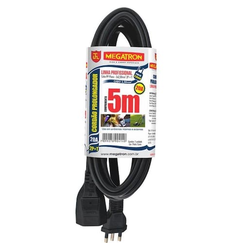 CORDAO PROLONGADOR PP 3X2,50X5,00MT 2P+T 20A/250V PT MEGATRONApresentamos os cordões prolongadores 20A, produtos de qualidade e que garantem segurança aos usuários, atendendo ao novo padrão brasileiro de plugues e tomadas (NBR 14136).Modelo: Cordão Prolongador 20AAmperagem: 20A / 250VEspessura do cabo: 2,50mm²Número de tomadas: 01*Ideal para: Para prolongar a tomada dos equipamentos para distancias longas, de até 5 mt. É utilizado geralmente em trabalhos com betoneiras, cortadores de gramas, ferramentas, entre outros.**Imagens meramente ilustrativa.*Marca: MegatronCódigo:79879