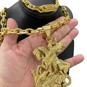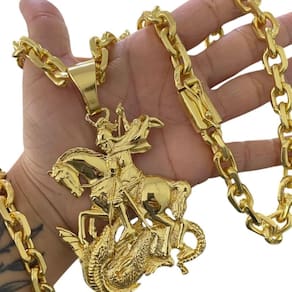 Cordão + Pulseira 12mm + Pingente São Jorge - Banhado a ouro Detalhes do Produto: Material: ligas metálicas de alta qualidade, especialmente tratadas para fixação e absorção do ouro, com acabamento em verniz protetor. Aparência: visual idêntico ao ouro maciço. Produção: artesanal, com atenção meticulosa aos detalhes. Banho: 10 camadas espessas de ouro 18k, finalizadas com verniz antialérgico . Elos: soldados varia conforme o modelo . Pedras: zircônias brilhantes cravejadas quando aplicável . Tamanhos Disponíveis: Cordões Masculinos: 70cm padrão e 60cm sob consulta/Pedido Via Chat . Cordões Femininos: 50cm padrão e 45cm sob consulta/Pedido Via Chat . Pulseiras: 21cm padrão ; tamanhos de 18cm a 23cm sob consulta/Pedido Via Chat. Pingentes: conforme imagens; consulte para mais detalhes via chat. Espessuras Recomendadas para Cordões / Pingentes: P: 1mm a 4mm M: 4mm a 8mm G: 6mm a 13mm Gg: 12mm a 18mm Incluso na Compra: Saquinho de organza para armazenamento seguro. Caixa elegante, perfeita para presente. Cupom de desconto para a próxima compra. Flyer com outros produtos da coleção. Carta de agradecimento personalizada. Adesivo da marca ToJoia18k. Informações Adicionais: : 6 meses termos acompanham o produto . Devolução: 7 dias para devolução sem questionamentos. Envio: despacho em até 24 horas úteis após confirmação do pagamento. Cuidados com a Peça: Evite contato com produtos químicos; aguarde o perfume secar antes de usar. Evite contato com shampoo, condicionadores e suor excessivo. Armazene em local seco, preferencialmente no saquinho de organza fornecido. Uso no mar e piscina é permitido; lave com água corrente e sabão neutro após. Por que Escolher a ToJoia18k Semi-joias luxuosas que combinam estilo, qualidade e sofisticação. Banho espesso de ouro 18k, garantindo brilho duradouro e acabamento impecável. Design exclusivo e produção artesanal, perfeitos para qualquer ocasião. Materiais premium que asseguram durabilidade. Ao escolher uma semi-joia ToJoia18k, você investe em qualidade, elegância e uma experiência única. Aguardamos sua compra Observação: pode ocorrer variação no fecho raramente . Imagens reais, sem edição. Qualquer dúvida, estamos à disposição para esclarecimentos. Marca: Não Informado Ean: 7892285680144