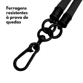 Cordão de alta resistência com mosquetões metálicos giratórios e adaptador universal.Tipo