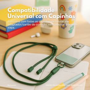 Cordão resistente com ajuste de tamanho para uso no pescoço ou costas, compatível com qualquer modelo de celular com capa.Tipo