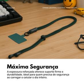 Leve seu celular com estilo e liberdade! O Cordão Universal da NERDCASE é feito em poliéster resistente, medindo 75cm de comprimento e 0,5mm de espessura, na cor verde escuro, com ajuste de tamanho para uso transversal, no pescoço ou costas. Ideal para qualquer modelo de celular com capa, ele acompanha base adesiva compatível. Um acessório funcional para quem quer manter o celular sempre à mão com conforto e segurança no dia a dia, viagens ou rolês.