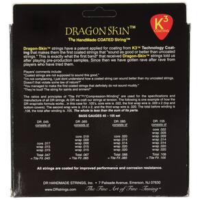 dsb5 – 40 Dragon cordas de luz 5 cordas graves revestido de pele. Dr. cordas Dragon pele cordas têm uma patente pendente proprietário revestimento de revestimento K3 tecnologia que os torna o primeiro revestidas cordas que "som tão bom ou melhor do que as cordas não revestido." Tecnologia K3 revestimento do Dr. é o primeiro revestimento que não faz desculpas e não excuses para não fornecendo um som igual ao revestido cordas. Os jogadores dizem que essas cordas têm mais volume, menos toques indesejados, maior clareza e articulação do padrão, cordas não revestido. Porém, elas fornecem o mesmo tom de proteção contra corrosão e transpiração, bem como uma maior vida que revestidas cordas são conhecidos por. Dr. feito à mão cordas combinam artesanato com os materiais muito melhor feito na América de antigamente. calibres 40 – 60 – 80 – 100 – 120.