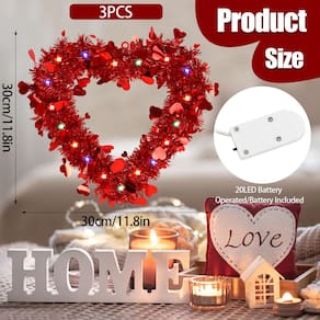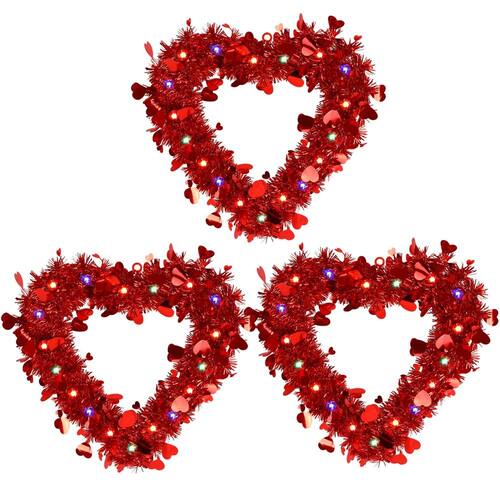 Grinalda de coração de relit de dia dos namorados decoração de folha vermelha tinsel coroa em forma de coração com cordão de luzes penduradas decoração de tinsel para decoração de porta da frente interior e exterior - Pacote: Você receberá 3 unidades pré-iluminadas para o Dia dos Namorados em formato de coração vermelho com LED multicolorido de 20 quilates. Cada guirlanda de coração dos namorados tem cerca de 30 x 30 cm de tamanho; grande e brilhante o suficiente para atender às suas necessidades e chamar a atenção das pessoas, perfeita para decoração de dia dos namorados em ambientes internos e externos. - Alta qualidade: a guirlanda pré-iluminada dos namorados é feita de enfeites metálicos, com moldura interna de plástico premium e é moldada em forma de coração por fio de metal, durável e resistente, fácil de pendurar e reutilizável por um longo tempo. - Guirlanda de LED em forma de coração: a guirlanda vermelha é projetada em forma de coração, com lantejoulas de folha de coração de amor. E a cor vermelha é muito atraente. Delicada e romântica, cheia de características do Dia dos Namorados. Além disso, cada guirlanda é combinada com luzes coloridas para torná-la atraente o tempo todo. Alimentado pela caixa de baterias (3 pilhas AA não incluídas). E essas luzes têm duas funções: cintilante/flash ou estável. - Fácil de pendurar: cada guirlanda de enfeites pré-iluminada em forma de coração tem um laço para pendurar na parte superior para que você possa pendurá-la onde quiser convenientemente. Você pode pendurá-la na parede, janela, porta e mais lugares onde você gosta de decorar seu quarto. - Ampla aplicação: estas decorações de guirlanda em forma de coração vermelho são perfeitas para o Dia dos Namorados, casamentos, noivados, aniversários, festas de aniversário, propostas e muito mais. Você pode janelas, tetos, paredes, cornija, mesas, etc. Traga uma atmosfera romântica para sua casa e festa.