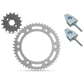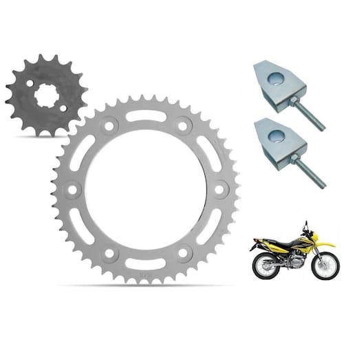 itens inclusos: 01 coroa - 01 pinhão - 01 corrente sem retentor - 02 esticadores de corrente