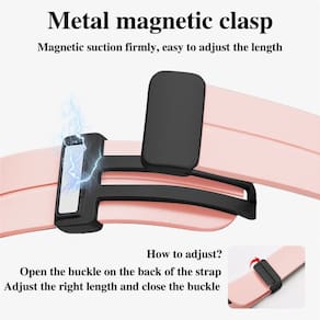 Feita de silicone de alta qualidade, suave, confortável e que não irrita a pele. Material transpirável e design especial, resistente ao água e ao suor. Broche em aço inoxidável com ajuste automático por ímã. Comprimento ajustável entre 130 mm e 200 mm. Compatível com a maioria das pulseiras.Tipo