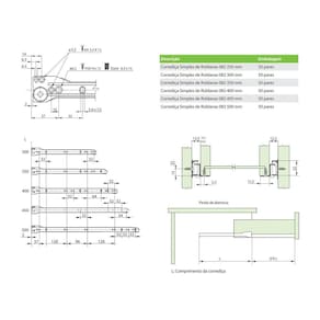 Corrediça Simples de Roldanas TTS 082 Corrediça simples com abertura 3/4 do comprimento nominal e deslizamento suave com roldanas de poliacetal autolubrificadas. Duplo travamento aberto e sistema de fechamento automático Self-Closing e perfil Captive para compensar folgas laterais e estabilidade da gaveta. Material: Aço laminadoAcabamento: Pintura eletrostática epóxi branco, preto ou cinzaMedidas: 250, 300, 350, 400, 450 e 500 mmCapacidade: 15 kg por par Observações: Pode ser fornecida em bruto para soldar em gavetas metálicas. Recomendações de uso: Pode ser utilizada em gavetas de cozinhas, closets, quartos, banheiros, lavanderias, móveis em geral ou em prateleiras retráteis/extensíveis. Também tem seu uso previsto em bases para teclado. Benefícios: Fácil instalação Variedade de cores e medidas Excelente custo/benefício