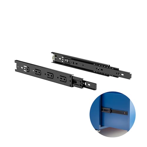 A Corrediça Telescópica Steel da Soprano é robusta e funcional, ideal para gavetas em diversos ambientes. Com trilhos deslizantes, permite abertura total com suavidade e precisão. Feita em aço com acabamento preto, oferece resistência à oxidação, sendo ideal para regiões úmidas. Suporta até 45kg por par e possui travas de segurança para evitar quedas.