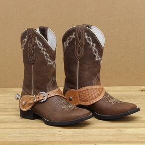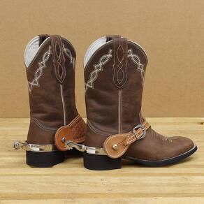 Correia de espora larga Bronc-Steel fabricada em couro na cor Natural com Óleo com costuras reforçadas, bordados (entalhados) e fivelas de aço inox para regulagem.