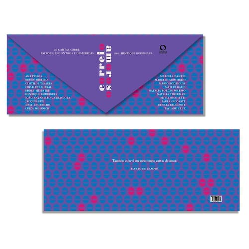 São bastante conhecidos os versos “Todas as cartas de amor são / Ridículas”, do Fernando Pessoa, na verdade pelo seu heterônimo Álvaro de Campos. Prática tão comum quanto a poesia adolescente, escrever cartas de amor faz parte da história de quase todas as pessoas, num tipo de texto que vai do recado banal ao confessionário mais íntimo e secreto. Desde o chamado gênero epistolar, cuja técnica rendeu grandes romances entre os séculos 18 e 19, até a própria valorização da troca de cartas entre escritores, as missivas literárias atraem muitas pessoas, estabelecendo uma relação de proximidade entre texto e leitores. E hoje, nesse tempo em que milhões de mensagens são trocadas a cada dia, evaporando-se no ar com a mesma velocidade com que são criadas, como seriam cartas de amor literárias? Pensando nesse exercício, Henrique Rodrigues convidou outros 19 escritores, de diferentes dicções, para escreverem cartas partindo do amor como temática. O resultado é a antologia CORREIO AMOROSO – 20 CARTAS SOBRE PAIXÕES, ENCONTROS E DESPEDIDAS. O livro apresenta um recorte da diversidade da literatura brasileira contemporânea, retratando também as diferentes formas de manifestação do amor. O livro vem encartado numa sobrecapa em forma de envelope, que, ao ser desdobrada, se revela a forma de um coração. A sobrecapa-envelope traz o poema Todas as cartas de amor são ridículas, de Álvaro de Campos (Fernando Pessoa), mencionado no texto de apresentação do livro. Em alusão ao poema, a própria forma de coração do envelope traz, propositalmente, um pouco desse “ridículo” do poema.