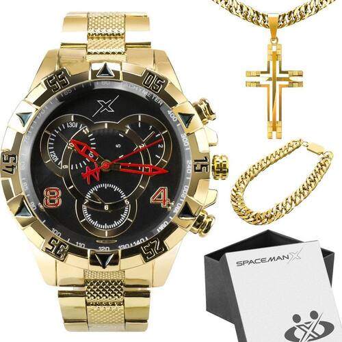 Corrente + caixa + relogio masculino aço dourado analogico Kit de Presente Orizom Spaceman X - Relógio Masculino, Corrente, Pingente e Pulseira
