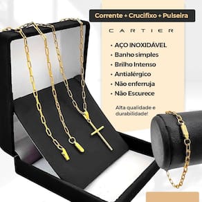 Corrente dourada aço inox + Pulseira + pingente crucifixo Kit de Acessórios Masculinos - Cordão, Pingente e Pulseira Banhados a Ouro 18K