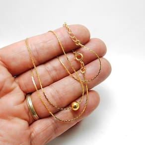 Corrente Feminina 40/45cm 0.5mm Bolinha 6mm Folheado Ouro 18k GG125 Corrente Feminina 40/45cm 0.5mm 4Gr - Bolinha 6mm - Fecho Boia Beleza e Qualidade Sempre -marca: Wnbijouterias -modelo: Coreana -modelo Fecho: Boia -comprimento: 40/45cm -largura: 0.5mm -peso: 4Gr -SKU Vendedor: GG125 Descrição Técnica: Corrente com banho super resistente. Processo de Folheação em 3 Camadas de Ouro 18k= 750 Não descasca, não perde a cor, qualidade garantida Grande tempo de durabilidade. Acompanha caixinha porta Jóia. Todas as Fotos são Reais do Produto Acompanha: Certificado de apenas para descascamento do banho da jóia. não cobre defeitos de mau uso, aranhões ou quebra de partes da jóia. Contra Indicações: Não usar creme, perfume, protetor solar e outros cosméticos por cima da jóia. Evitar banho de mar Devido a oxidação da água Salgada Evitar banho de piscina Devido a oxidação do Cloro e outros produtos