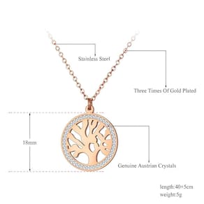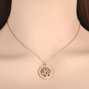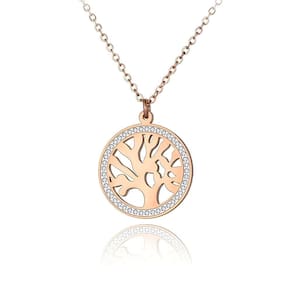 Lindo colar em aço inoxidável banhado a ouro rosê, com a representação da Árvore da vida e um círculo de cristais ao seu redor.