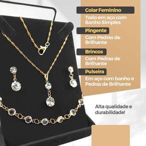Corrente Feminina Veneziana + Pulseira + Brincos + Pingente Strass - Aço Inoxidável Dourado - Orizom Este kit de colar, brincos e pulseira é a escolha perfeita para quem procura acessórios femininos de alta qualidade. As fotos e o vídeo deste anúncio são REAIS dos produtos, garantindo total transparência em sua compra. Adicione um toque sofisticado ao seu guarda-roupa com este conjunto elegante, criando um visual harmonioso que realça sua beleza natural em qualquer ocasião. Feitos com materiais de alta qualidade, esses acessórios são resistentes e duráveis, com acabamentos refinados. Além disso, são antialérgicos, resistentes à corrosão e oxidação, mantendo um brilho duradouro. Práticos e elegantes, esses acessórios complementam seu estilo com excelente qualidade. A caixa não está inclusa nesta . IMPORTANTE: A caixa dos acessórios não está inclusa. As fotos da caixa são meramente ilustrativas. Marca: Não Informado