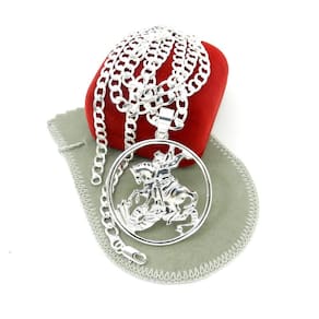Corrente Masculina 70Cm 5Mm São Jorge Folheada Prata CR847 - A corrente masculina é feita com materiais de alta qualidade e possui um banho super resistente em várias camadas de Prata Pura 1000 . Com um comprimento de 70cm e largura de 5mm, possui um caimento perfeito. O pingente de São Jorge traz um toque de proteção e simbolismo para a corrente. Acompanha embalagem/porta jóia e certificado de . Evite o contato com cosméticos e água salgada ou clorada para garantir a durabilidade da corrente. Adicione estilo e personalidade ao seu visual com essa jóia masculina de qualidade. Compre agora mesmo e surpreenda-se. Ean: 7896182892624