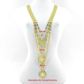 Corrente Masculina 80cm 4mm + Estrela Folheado Ouro CR806C Corrente Masculina 80cm 4mm 14Gr + Estrela 25mm 3Gr - Fecho Boia Beleza e Qualidade Sempre -Marca: Wnbijouterias -Pingente: Estrela 5 Pontas 25mm -Modelo: 1x1 Longo -Modelo Fecho: Boia -Comprimento: 80cm -Largura: 4mm -Peso: 14+3Gr -SKU Vendedor: CR806C Descrição Técnica: - Produto com banho super resistente. - Processo de Folheação em 3 Camadas de Ouro 18k= 750 - Não descasca, não perde a cor, qualidade garantida - Grande tempo de durabilidade. - Acompanha Embalagem/Porta Jóia - Todas as Fotos são Reais do Produto Acompanha: Certificado de garantia -Garantia apenas para descascamento do banho da jóia. -A garantia não cobre defeitos de mau uso, aranhões ou quebra de partes da jóia. Contra Indicações: - Não usar creme, shampoo, perfume, protetor solar e outros cosméticos por cima da jóia. - Evitar banho de mar Devido a oxidação da água Salgada - Evitar banho de piscina Devido a oxidação do Cloro e outros produtos O que você GANHA comprando em nossa loja: - Qualidade Banho Super Resistente - Antialérgico Não usamos Níquel em nosso banho - Beleza e Acabamento Caimento perfeito ao usar Ean: 7896180990070