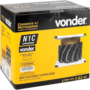 Corrente N1C Para Motosserra Rolo Com 7,62 Metros 25 Pés Vonder Marca: VonderConteúdo da Embalagem:1 Rolo de corrente com 7,62 m 25 pés Destaques e diferenciais:A corrente semiquadrada é a melhor combinação de velocidade e durabilidadeAplicações e dicas de uso:Indicado para motosserra e eletrosserra cujo calibre do sabre seja de 0.050 1,3 mm .Características Técnicas:Tipo de dente da corrente: N1C - semiquadrada Passo da corrente.: 3/8 0.375 Perfil baixo Cálibre da corrente.: 0.050 - 1,3 mm Marca: Não Informado Ean: 7893946654054