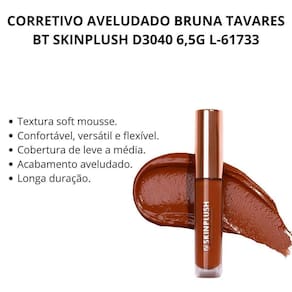 Corretivo Aveludado Bruna Tavares Bt Skinplush D3040 6,5G L-61733 Corretivo Aveludado Bt SkinPlush D3040 Um corretivo de textura soft mousse que oferece uma cobertura de leve a média e acabamento aveludado. Além de corrigir, iluminar e camuflar, o BT Skinplush conta com diversos ativos que ajudam a atenuar a aparência das olheiras e bolsas ao redor dos olhos. Ele também auxilia na hidratação e melhora da elasticidade da pele. Possui uma textura mousse, versátil e aveludada que garante maior conforto ao longo do uso. Ele é resistente à água, suor e oleosidade.Subtom quente avermelhado. . Benefícios -textura soft mousse. -confortável, versátil e flexível. -cobertura de leve a média. -acabamento aveludado. -longa duração. -oftalmologicamente testado. -dermatologicamente testado. -não testado em animais. . Modo de Uso Com o auxílio do aplicador, deposite o corretivo nas áreas que deseja disfarçar e corrigir.Em seguida, dê leves batidinhas com a esponja, a ponta dos dedos ou com um pincel, até o produto aderir na pele de maneira natural e sem marcas. Ean: 7896032679122
